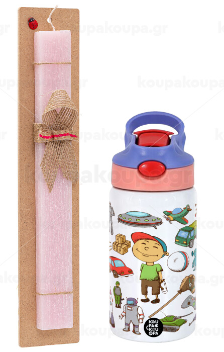 Toys Boy, Easter Set, Children's thermal stainless steel water bottle with safety straw, pink/purple (350ml) & Easter scented flat candle (30cm) (PINK)