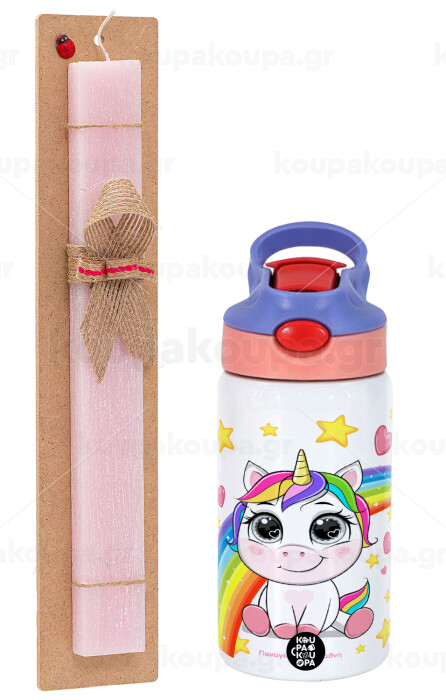 Unicorn baby με όνομα, Easter Set, Children's thermal stainless steel water bottle with safety straw, pink/purple (350ml) & Easter scented flat candle (30cm) (PINK)
