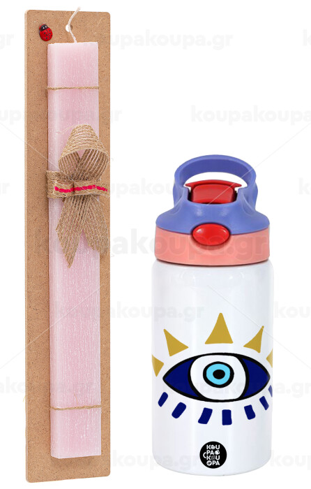 blue evil eye, Easter Set, Children's thermal stainless steel water bottle with safety straw, pink/purple (350ml) & Easter scented flat candle (30cm) (PINK)