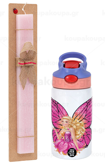 A fairy Barbie, Easter Set, Children's thermal stainless steel water bottle with safety straw, pink/purple (350ml) & Easter scented flat candle (30cm) (PINK)
