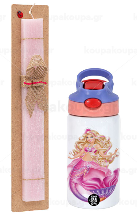 Barbie mermaid , Easter Set, Children's thermal stainless steel water bottle with safety straw, pink/purple (350ml) & Easter scented flat candle (30cm) (PINK)