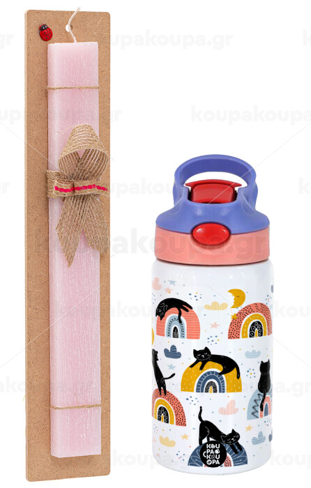 Γατούλες, Easter Set, Children's thermal stainless steel water bottle with safety straw, pink/purple (350ml) & Easter scented flat candle (30cm) (PINK)
