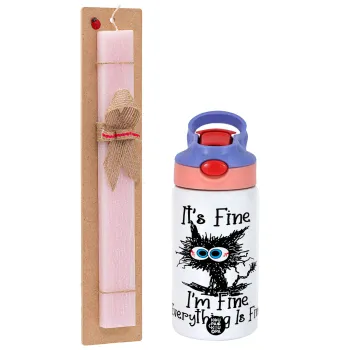 Cat, It's Fine I'm Fine Everything Is Fine, Easter Set, Children's thermal stainless steel water bottle with safety straw, pink/purple (350ml) & Easter scented flat candle (30cm) (PINK)