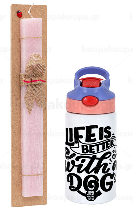 Life is better with a DOG, Easter Set, Children's thermal stainless steel water bottle with safety straw, pink/purple (350ml) & Easter scented flat candle (30cm) (PINK)