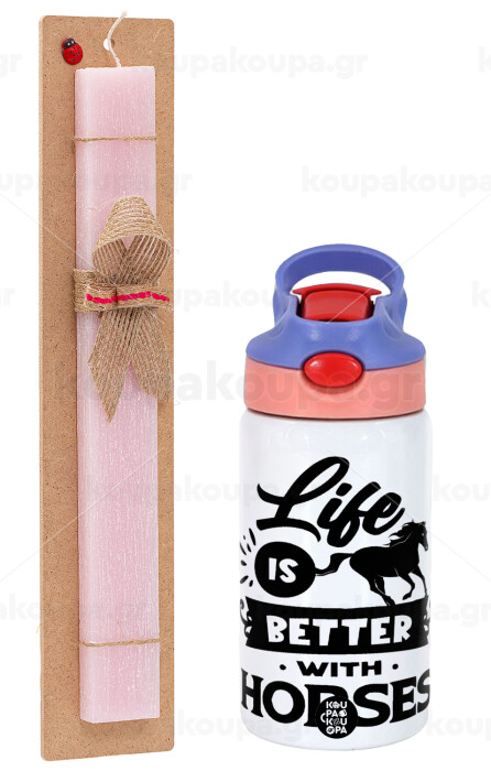 Life is Better with a Horses, Easter Set, Children's thermal stainless steel water bottle with safety straw, pink/purple (350ml) & Easter scented flat candle (30cm) (PINK)