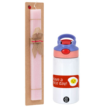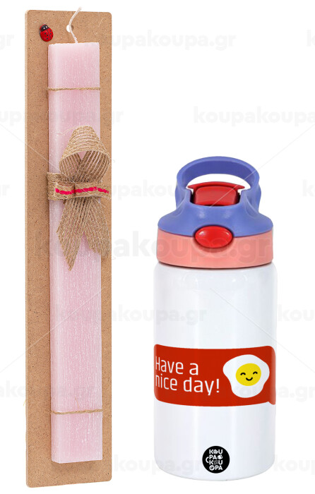 Have a nice day Emoji, Easter Set, Children's thermal stainless steel water bottle with safety straw, pink/purple (350ml) & Easter scented flat candle (30cm) (PINK)