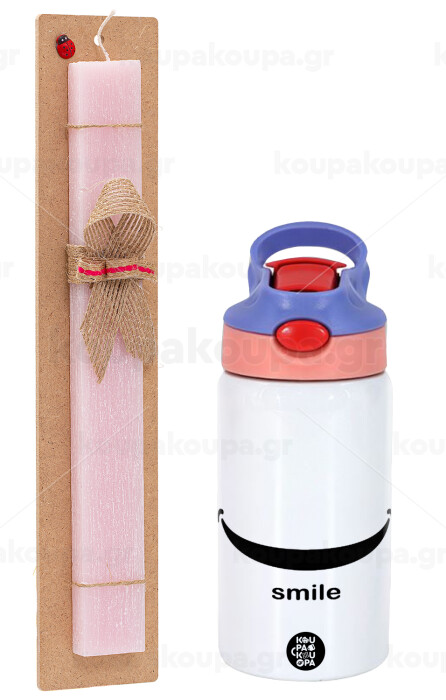 Smile!!!, Easter Set, Children's thermal stainless steel water bottle with safety straw, pink/purple (350ml) & Easter scented flat candle (30cm) (PINK)