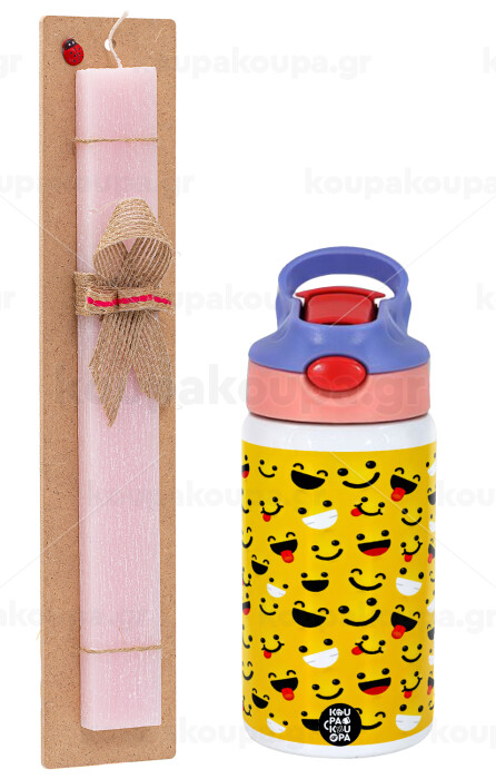 Smilies , Easter Set, Children's thermal stainless steel water bottle with safety straw, pink/purple (350ml) & Easter scented flat candle (30cm) (PINK)