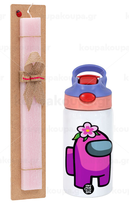 Among US girl, Easter Set, Children's thermal stainless steel water bottle with safety straw, pink/purple (350ml) & Easter scented flat candle (30cm) (PINK)