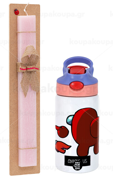 Among US i am impostor..., Easter Set, Children's thermal stainless steel water bottle with safety straw, pink/purple (350ml) & Easter scented flat candle (30cm) (PINK)