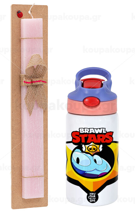 Brawl Stars Squeak, Easter Set, Children's thermal stainless steel water bottle with safety straw, pink/purple (350ml) & Easter scented flat candle (30cm) (PINK)