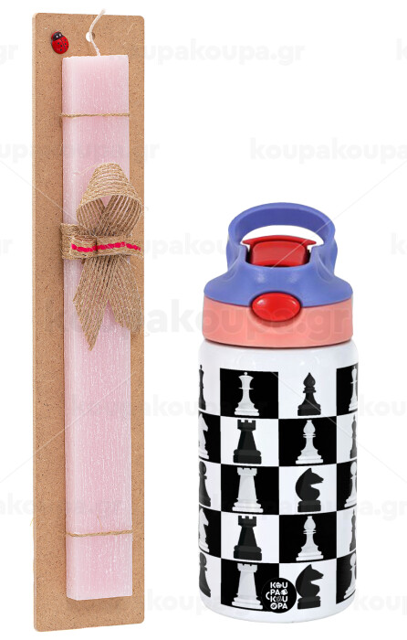Chess set, Easter Set, Children's thermal stainless steel water bottle with safety straw, pink/purple (350ml) & Easter scented flat candle (30cm) (PINK)