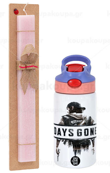Day's Gone, Easter Set, Children's thermal stainless steel water bottle with safety straw, pink/purple (350ml) & Easter scented flat candle (30cm) (PINK)
