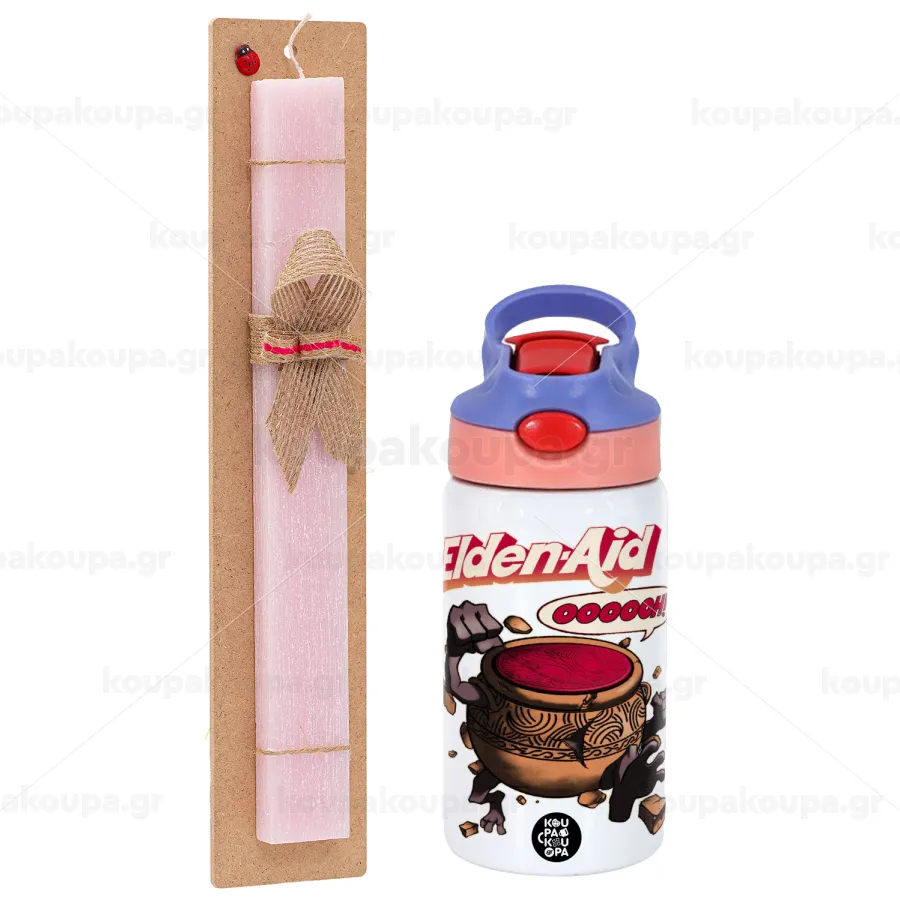 Elden-Aid, Elden Ring inspired , Easter Set, Children's thermal stainless steel water bottle with safety straw, pink/purple (350ml) & Easter scented flat candle (30cm) (PINK)
