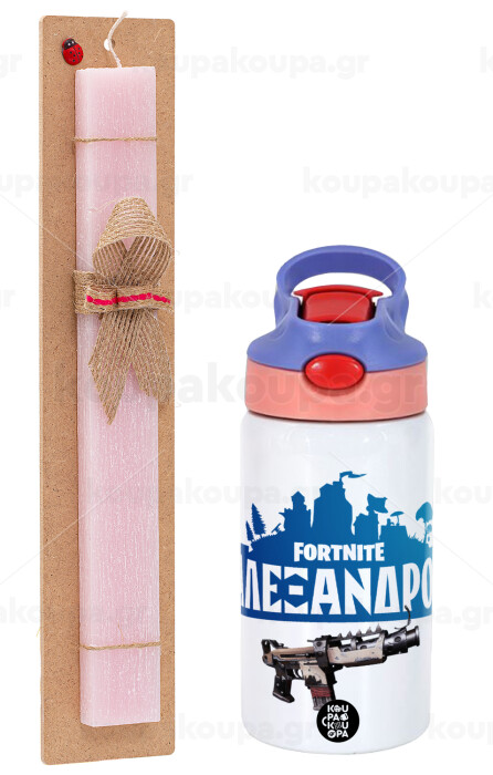 Fortnite with gun με το όνομα σου, Easter Set, Children's thermal stainless steel water bottle with safety straw, pink/purple (350ml) & Easter scented flat candle (30cm) (PINK)