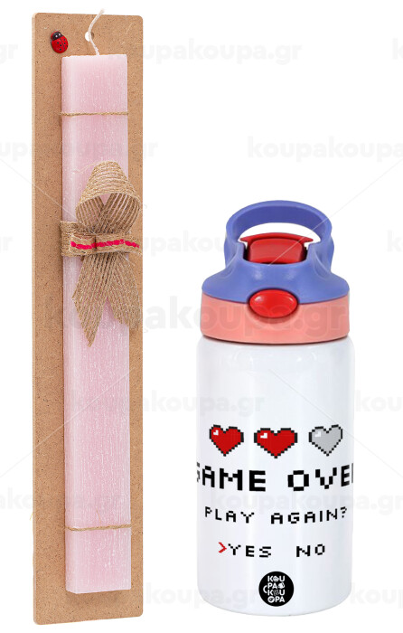 GAME OVER, Play again? YES - NO, Easter Set, Children's thermal stainless steel water bottle with safety straw, pink/purple (350ml) & Easter scented flat candle (30cm) (PINK)