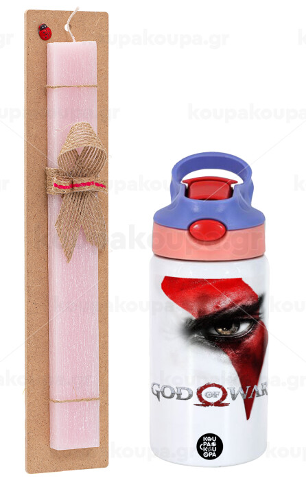 God of war Stratos, Easter Set, Children's thermal stainless steel water bottle with safety straw, pink/purple (350ml) & Easter scented flat candle (30cm) (PINK)