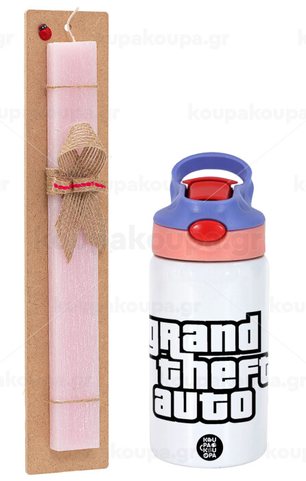 GTA (grand theft auto), Easter Set, Children's thermal stainless steel water bottle with safety straw, pink/purple (350ml) & Easter scented flat candle (30cm) (PINK)
