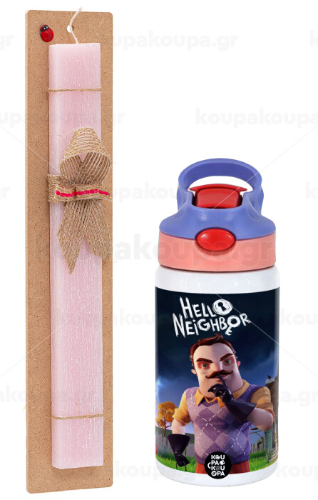 Hello Neighbor, Easter Set, Children's thermal stainless steel water bottle with safety straw, pink/purple (350ml) & Easter scented flat candle (30cm) (PINK)