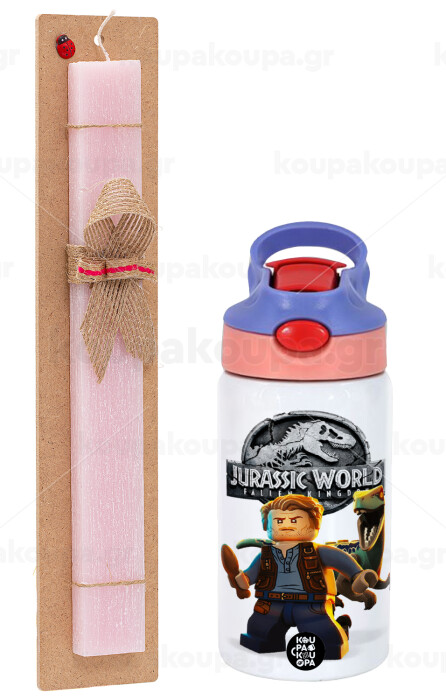 Jurassic world, Easter Set, Children's thermal stainless steel water bottle with safety straw, pink/purple (350ml) & Easter scented flat candle (30cm) (PINK)