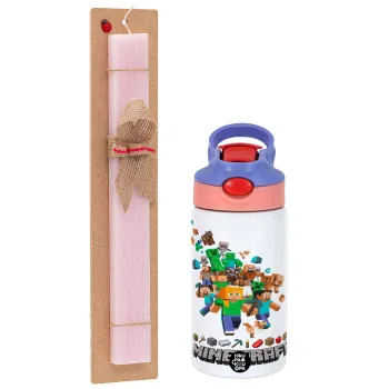 Minecraft adventure, Easter Set, Children's thermal stainless steel water bottle with safety straw, pink/purple (350ml) & Easter scented flat candle (30cm) (PINK)