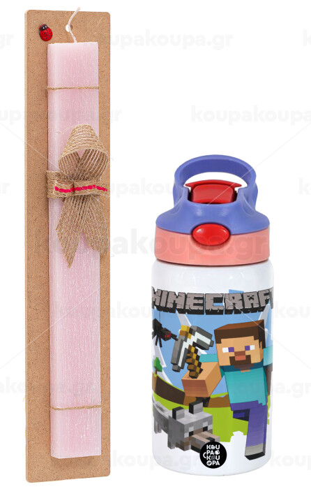 Minecraft Alex, Easter Set, Children's thermal stainless steel water bottle with safety straw, pink/purple (350ml) & Easter scented flat candle (30cm) (PINK)