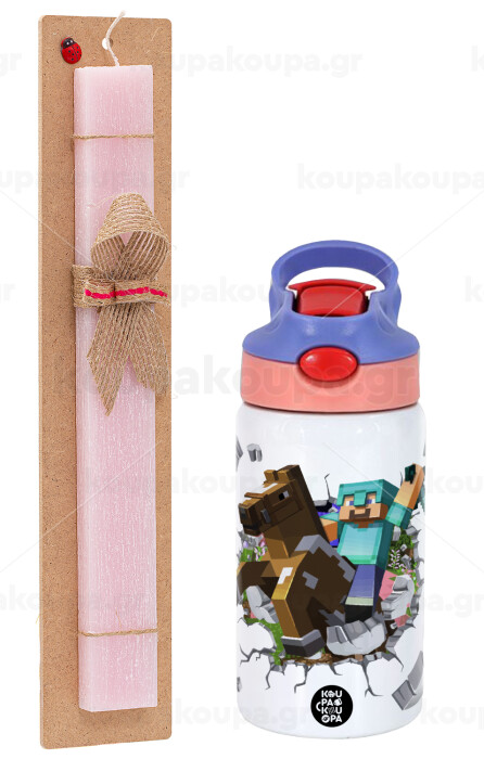 Minecraft brick, Easter Set, Children's thermal stainless steel water bottle with safety straw, pink/purple (350ml) & Easter scented flat candle (30cm) (PINK)