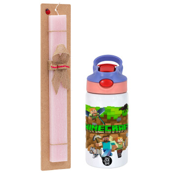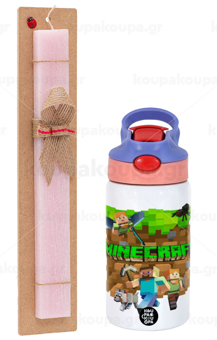 Minecraft characters, Easter Set, Children's thermal stainless steel water bottle with safety straw, pink/purple (350ml) & Easter scented flat candle (30cm) (PINK)
