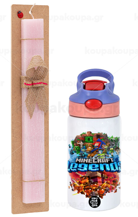 Minecraft legends, Easter Set, Children's thermal stainless steel water bottle with safety straw, pink/purple (350ml) & Easter scented flat candle (30cm) (PINK)