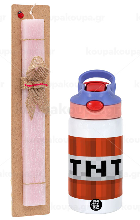 Minecraft TNT, Easter Set, Children's thermal stainless steel water bottle with safety straw, pink/purple (350ml) & Easter scented flat candle (30cm) (PINK)