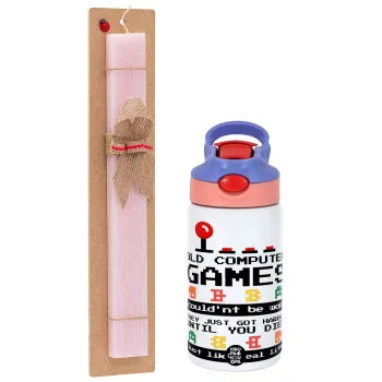 OLD computer games couldn't be won just like real life!, Easter Set, Children's thermal stainless steel water bottle with safety straw, pink/purple (350ml) & Easter scented flat candle (30cm) (PINK)
