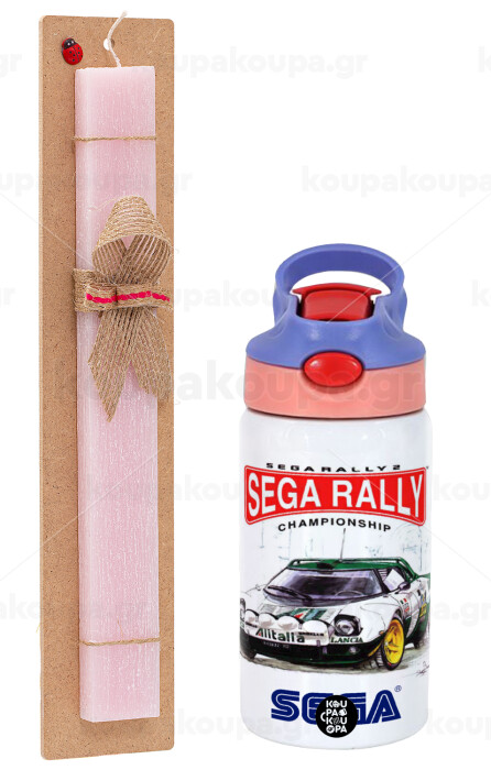 SEGA RALLY 2, Easter Set, Children's thermal stainless steel water bottle with safety straw, pink/purple (350ml) & Easter scented flat candle (30cm) (PINK)