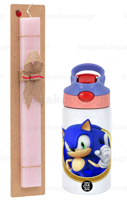 Sonic the hedgehog, Easter Set, Children's thermal stainless steel water bottle with safety straw, pink/purple (350ml) & Easter scented flat candle (30cm) (PINK)