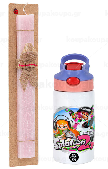 Splatoon 2, Easter Set, Children's thermal stainless steel water bottle with safety straw, pink/purple (350ml) & Easter scented flat candle (30cm) (PINK)