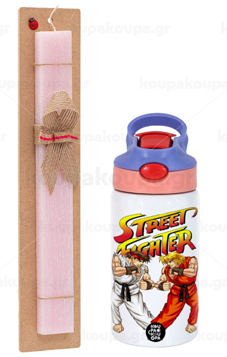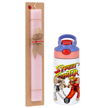 Street fighter, Easter Set, Children's thermal stainless steel water bottle with safety straw, pink/purple (350ml) & Easter scented flat candle (30cm) (PINK)