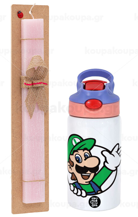 Super mario Luigi win, Easter Set, Children's thermal stainless steel water bottle with safety straw, pink/purple (350ml) & Easter scented flat candle (30cm) (PINK)