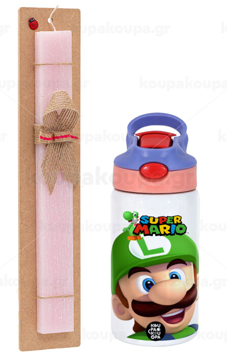 Super mario Luigi, Easter Set, Children's thermal stainless steel water bottle with safety straw, pink/purple (350ml) & Easter scented flat candle (30cm) (PINK)