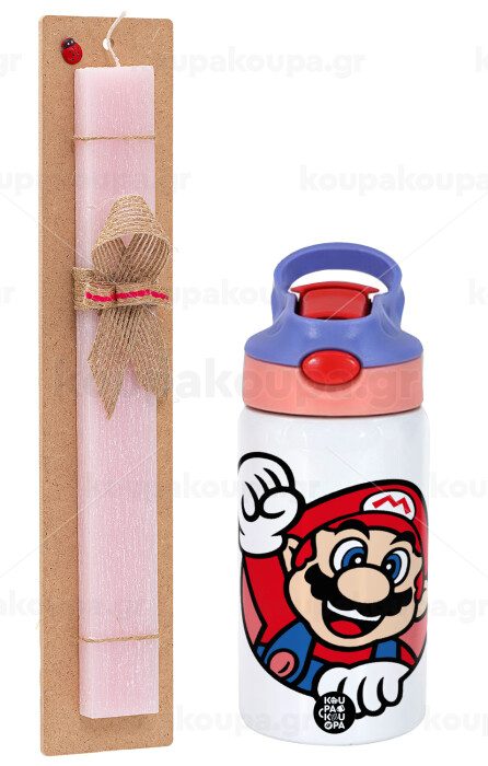Super mario win, Easter Set, Children's thermal stainless steel water bottle with safety straw, pink/purple (350ml) & Easter scented flat candle (30cm) (PINK)