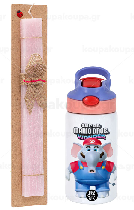 Super mario wonder, Easter Set, Children's thermal stainless steel water bottle with safety straw, pink/purple (350ml) & Easter scented flat candle (30cm) (PINK)
