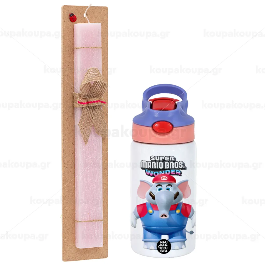 Super mario wonder, Easter Set, Children's thermal stainless steel water bottle with safety straw, pink/purple (350ml) & Easter scented flat candle (30cm) (PINK)