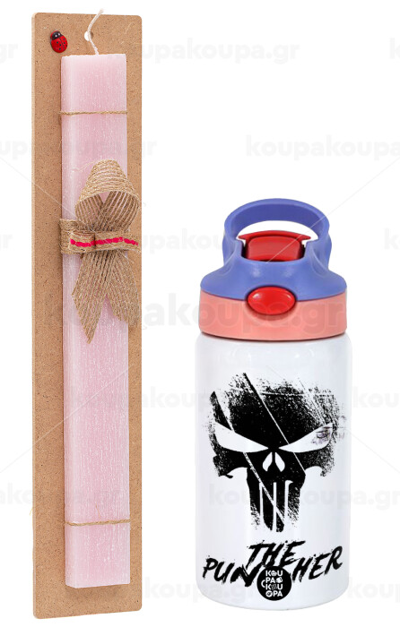 The punisher, Easter Set, Children's thermal stainless steel water bottle with safety straw, pink/purple (350ml) & Easter scented flat candle (30cm) (PINK)