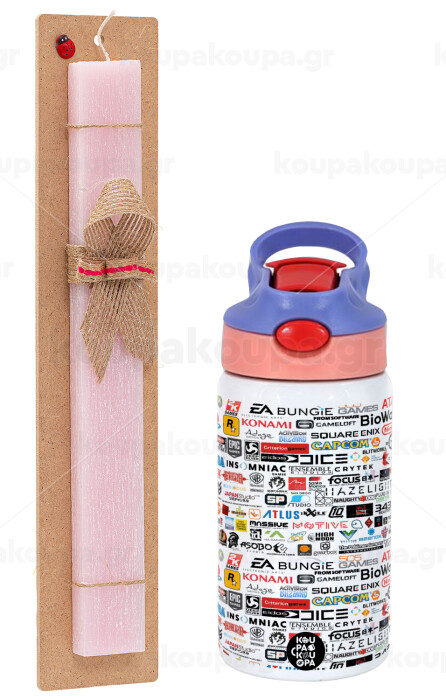 Video Game Studio Logos, Easter Set, Children's thermal stainless steel water bottle with safety straw, pink/purple (350ml) & Easter scented flat candle (30cm) (PINK)