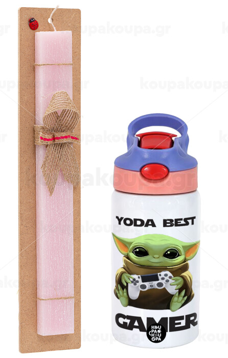 Yoda Best Gamer, Easter Set, Children's thermal stainless steel water bottle with safety straw, pink/purple (350ml) & Easter scented flat candle (30cm) (PINK)