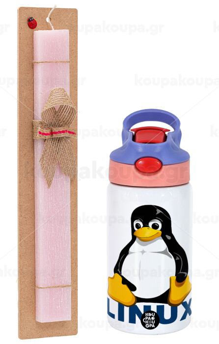 Linux, Easter Set, Children's thermal stainless steel water bottle with safety straw, pink/purple (350ml) & Easter scented flat candle (30cm) (PINK)