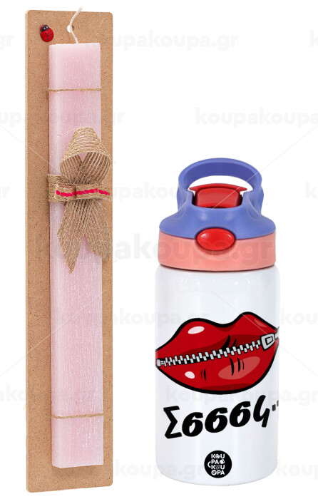 Σσσσς..., Easter Set, Children's thermal stainless steel water bottle with safety straw, pink/purple (350ml) & Easter scented flat candle (30cm) (PINK)