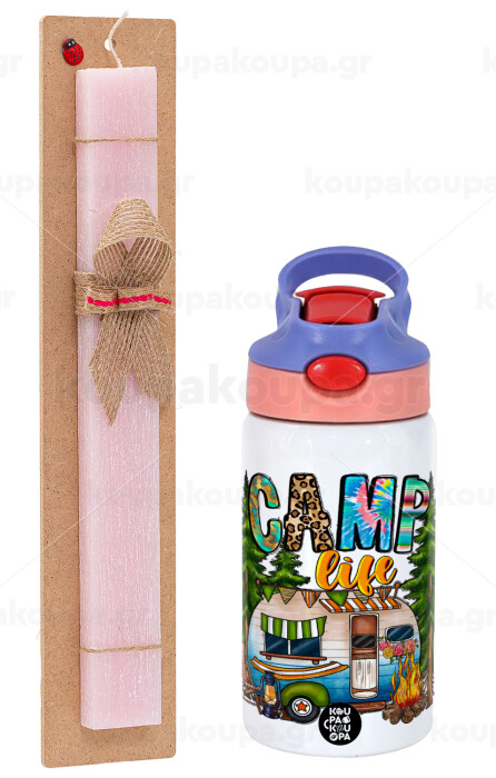 Camp Life, Easter Set, Children's thermal stainless steel water bottle with safety straw, pink/purple (350ml) & Easter scented flat candle (30cm) (PINK)
