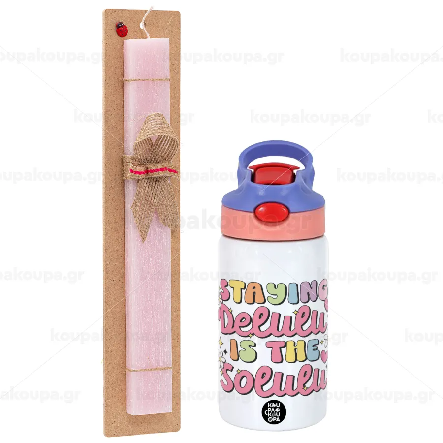 Delulu, Easter Set, Children's thermal stainless steel water bottle with safety straw, pink/purple (350ml) & Easter scented flat candle (30cm) (PINK)