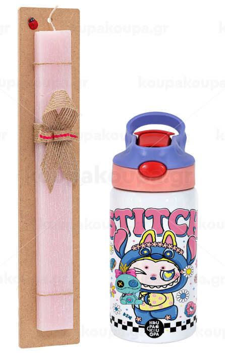 Labubu Stitch, Easter Set, Children's thermal stainless steel water bottle with safety straw, pink/purple (350ml) & Easter scented flat candle (30cm) (PINK)