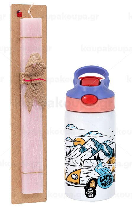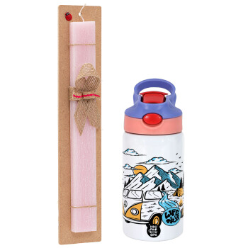 Life is a trip, Easter Set, Children's thermal stainless steel water bottle with safety straw, pink/purple (350ml) & Easter scented flat candle (30cm) (PINK)