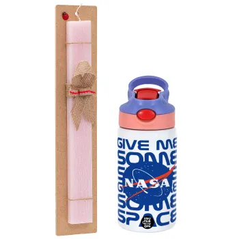 NASA give me some space, Easter Set, Children's thermal stainless steel water bottle with safety straw, pink/purple (350ml) & Easter scented flat candle (30cm) (PINK)